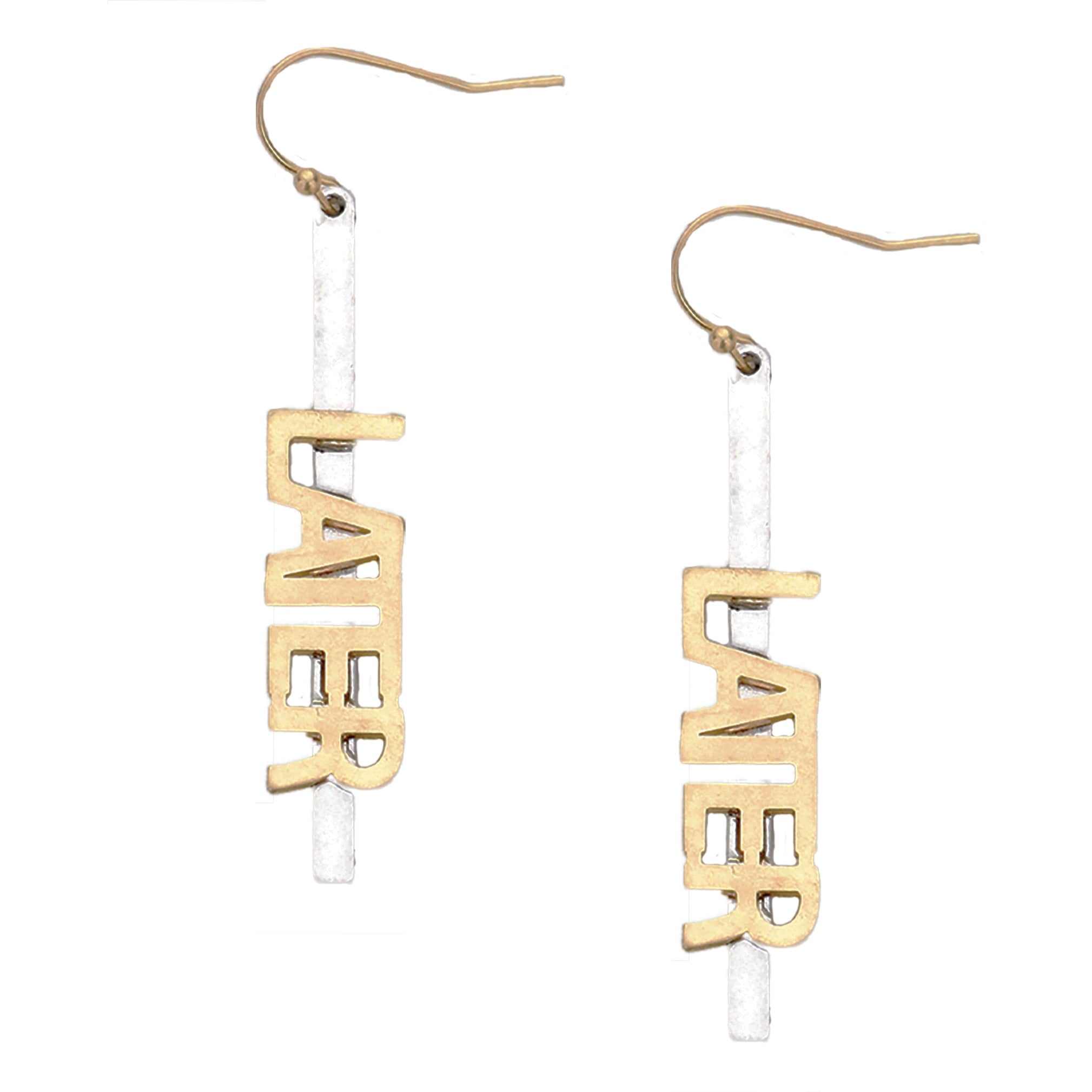 LATER Word Drop Earrings 🪩: Vertical gold lettering spells out “LATER” in a sassy font that says “don’t text, don’t call.”