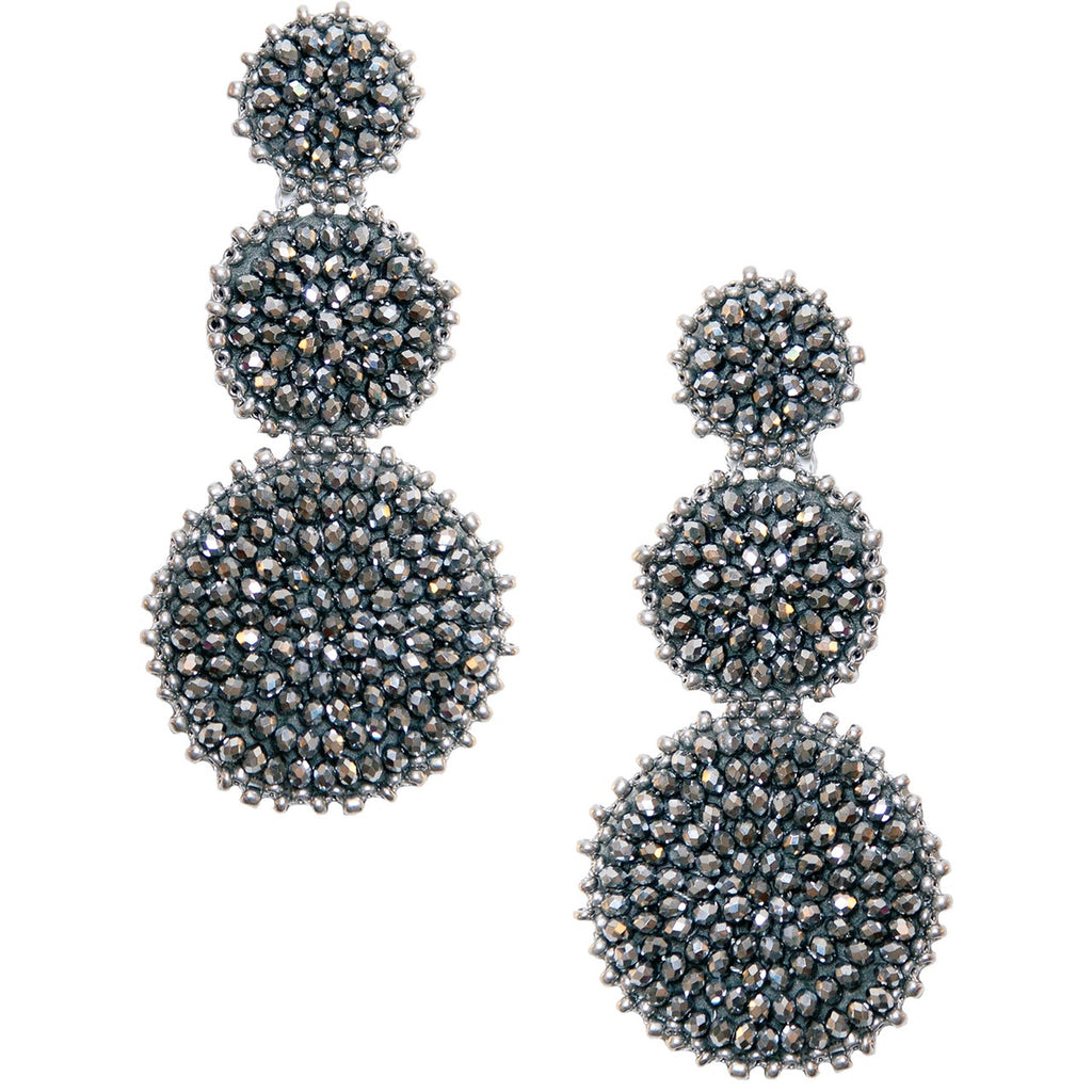 Blurring the line between lighting and Disco Ball, each circular tier in our Silver Disco Drop earrings acts as a radial focal point and a potent symbol of glittery glamour.