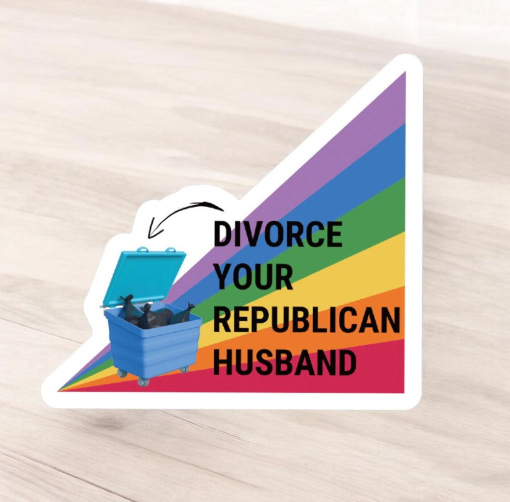 This vibrant sticker features the bold text "Divorce Your Republican Husband," set against a colorful rainbow backdrop. Perfect for adding a touch of humor to your belongings, this divorce-themed accessory showcases your individuality while making a statement. A must-have for those seeking to express their beliefs in style!