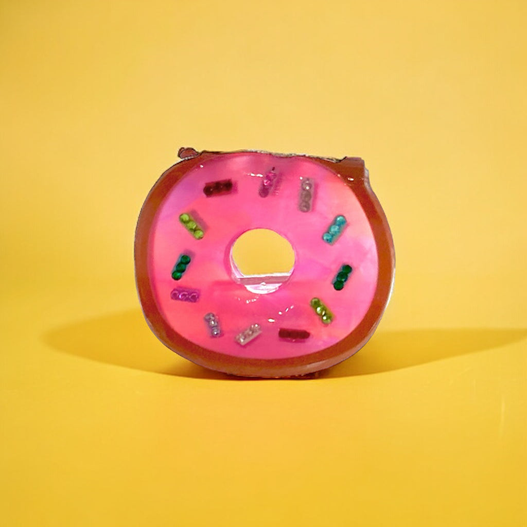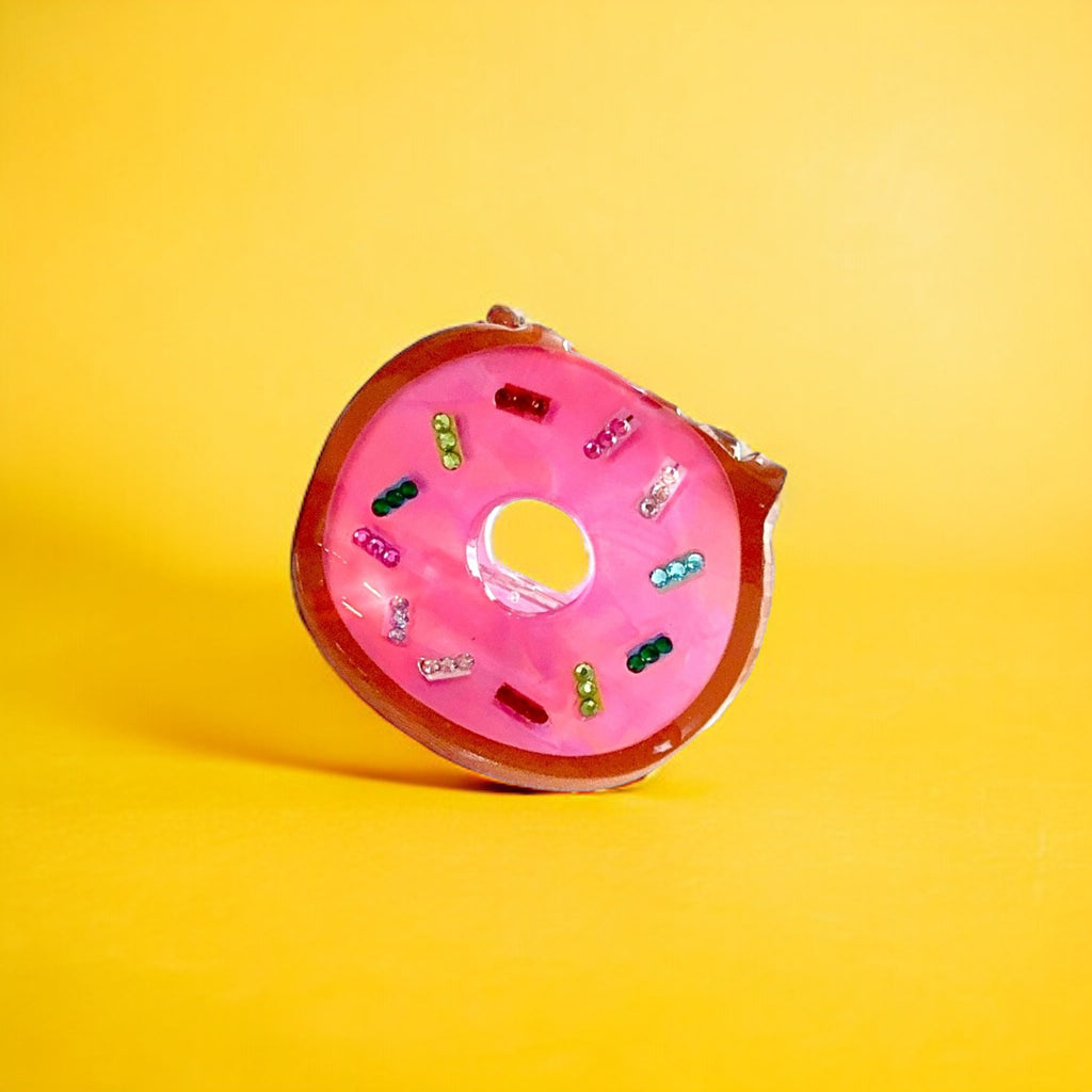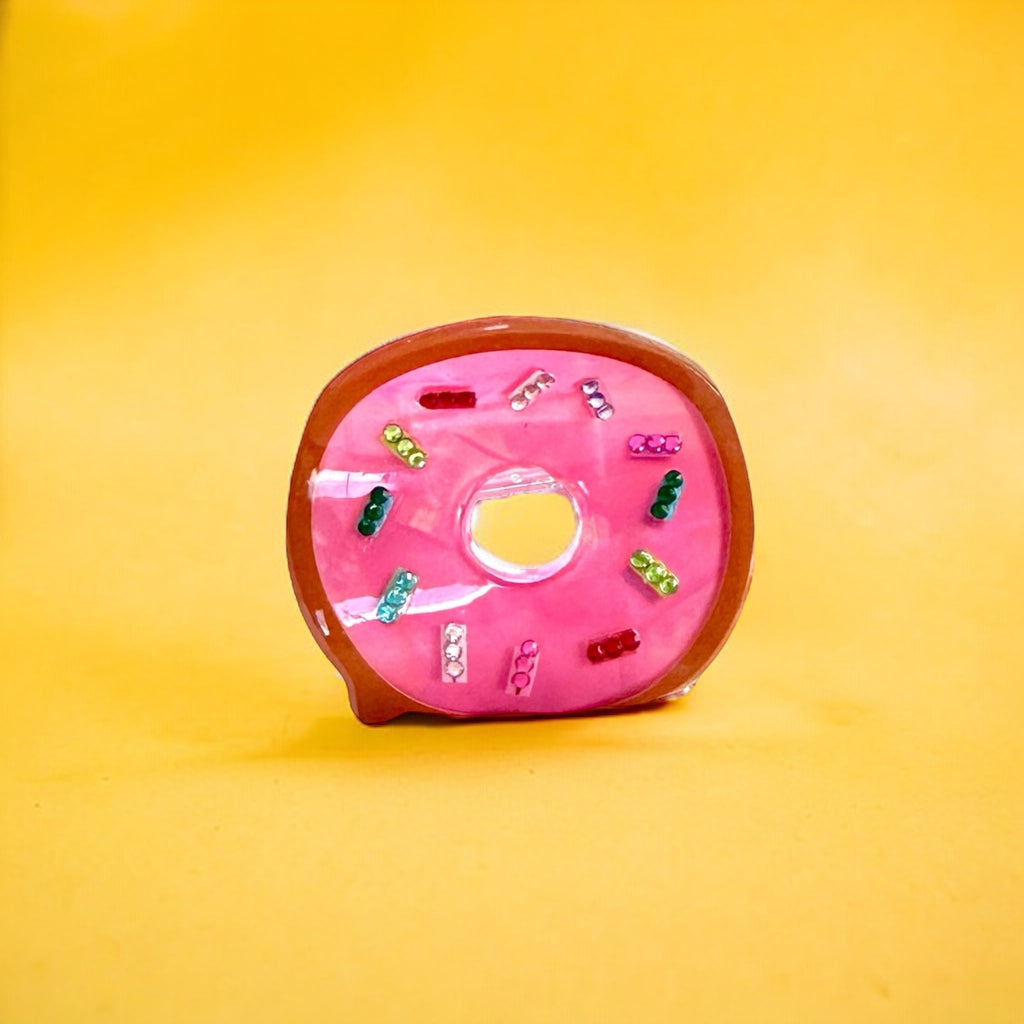 Donut Shaped Hair Clip 🍩: This hair clip features a delightful donut shape with a vibrant hot pink glaze and colorful sprinkles, making it a fun and quirky addition to any hairstyle.