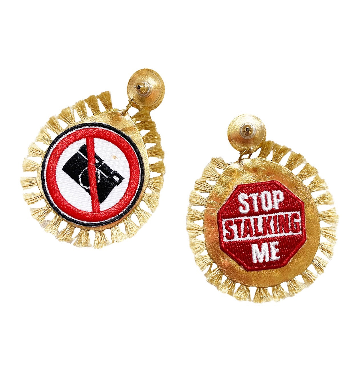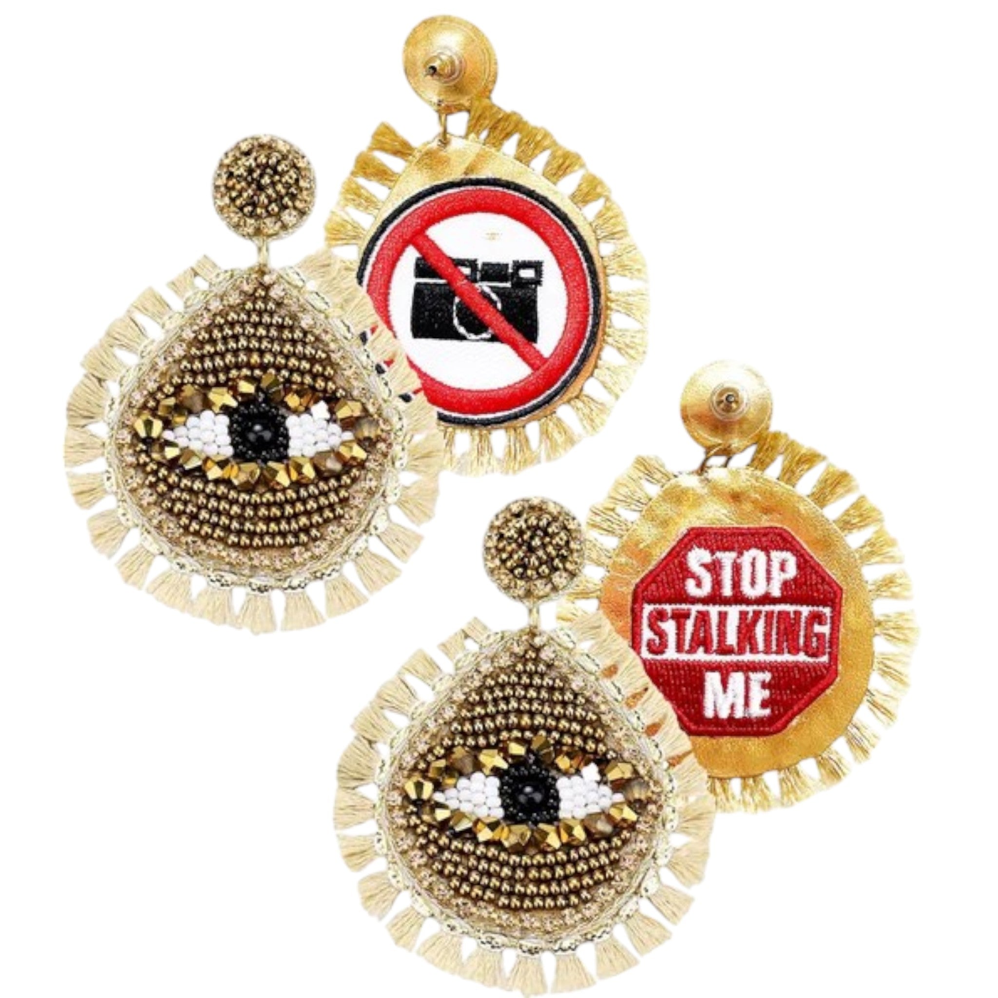 Pair these Evil Eye Tassel Gold Earrings with a chic dress for an evening out or with casual wear for a stylish twist. The "stop stalking me" patch adds a playful and unique element, making these earrings perfect for any occasion.