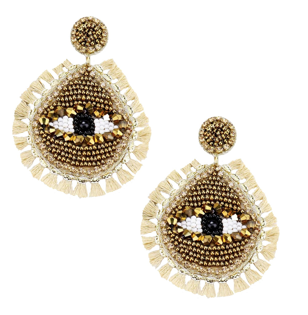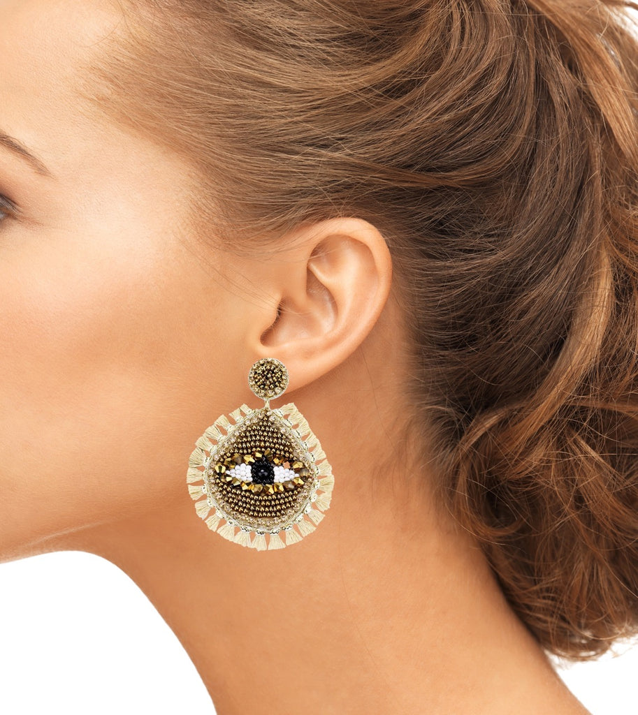 Prepare for the stares! Our Evil Eye Tassel Gold earrings will grab everyone's attention...which is why we're adding a "stop stalking me" patch to the back for good measure :)
