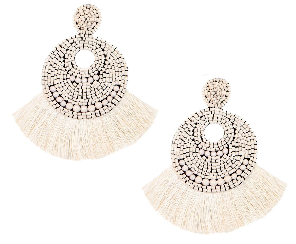 Pair these ivory fringe earrings with a strappy summer dress for a chic and playful look. Their neutral color makes them easy to mix and match with various outfits, perfect for both day and night events.
