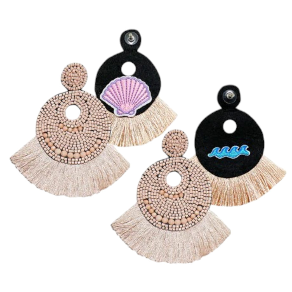 Elevate your accessory game with these Fringe Benefits Nude Earrings. Featuring a double fan fringe and intricate seed beadwork, these earrings offer a chic and playful seascape-inspired look. Perfect for pairing with beachwear or a casual outfit, these earrings add a touch of elegance to any ensemble.