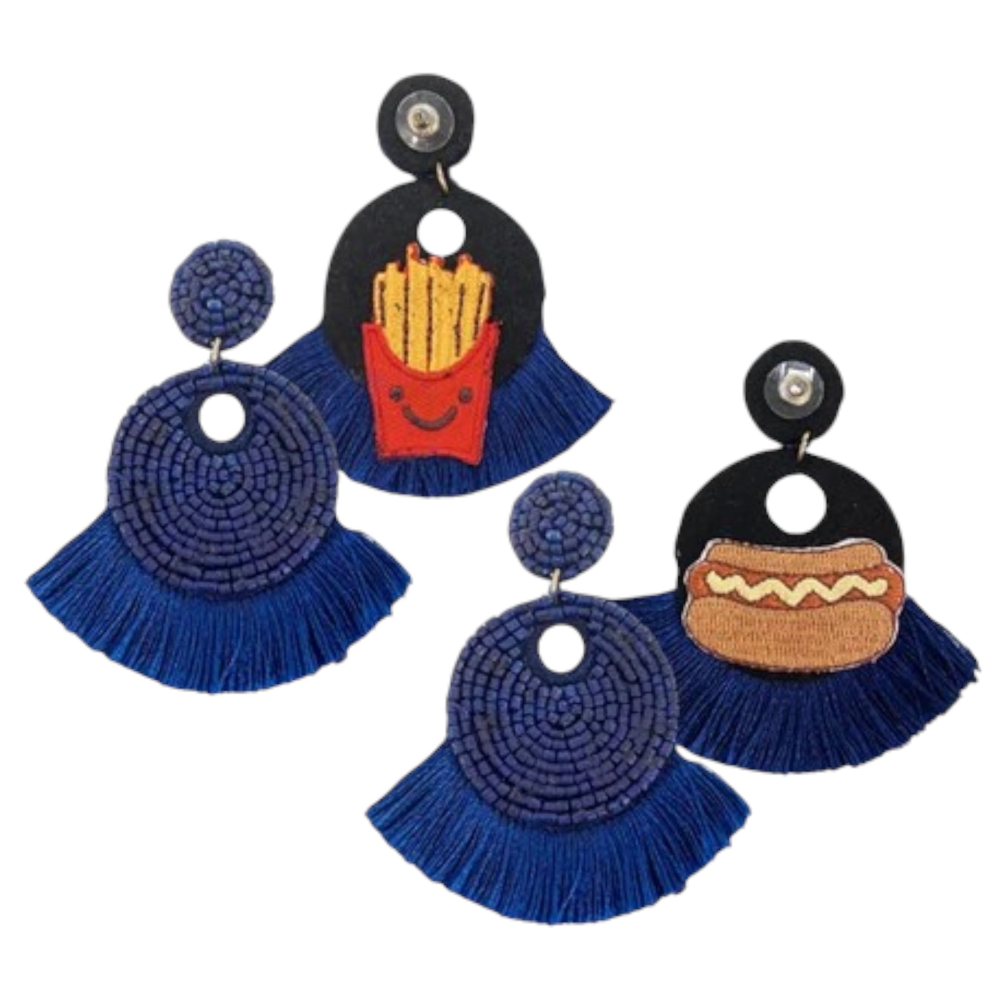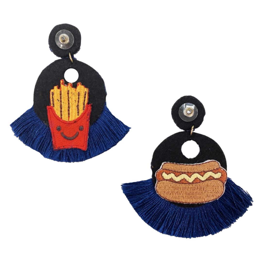 Unique Design: The Fringe Benefits Petit Navy Earrings feature deep navy tones with playful tassels and a fun "Avocado Toast" patch.