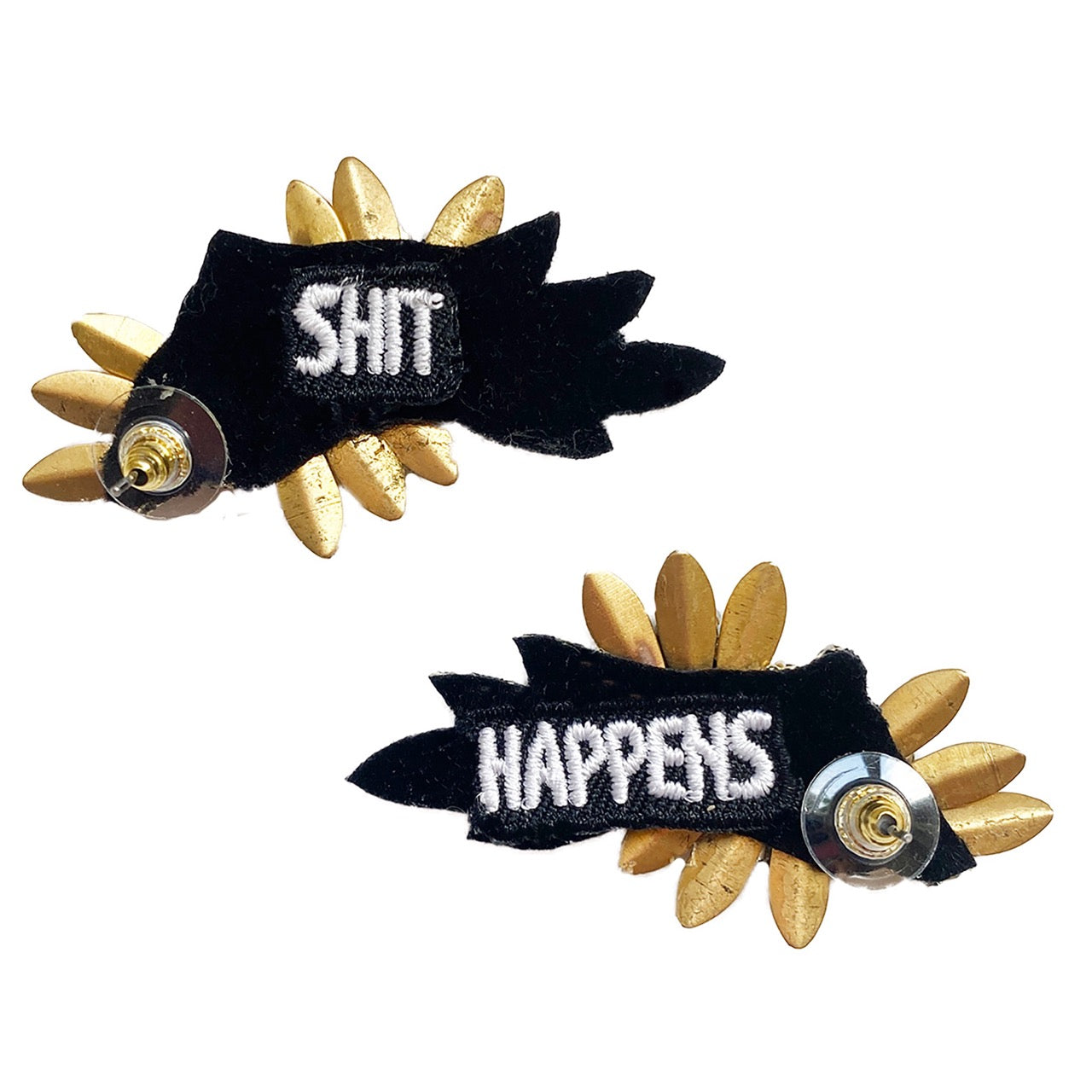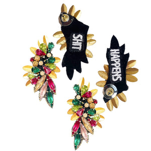 Bejeweled Earrings with “Shit Happens” Patch: Secret message embroidery makes these statement earrings totally unexpected and totally iconic.