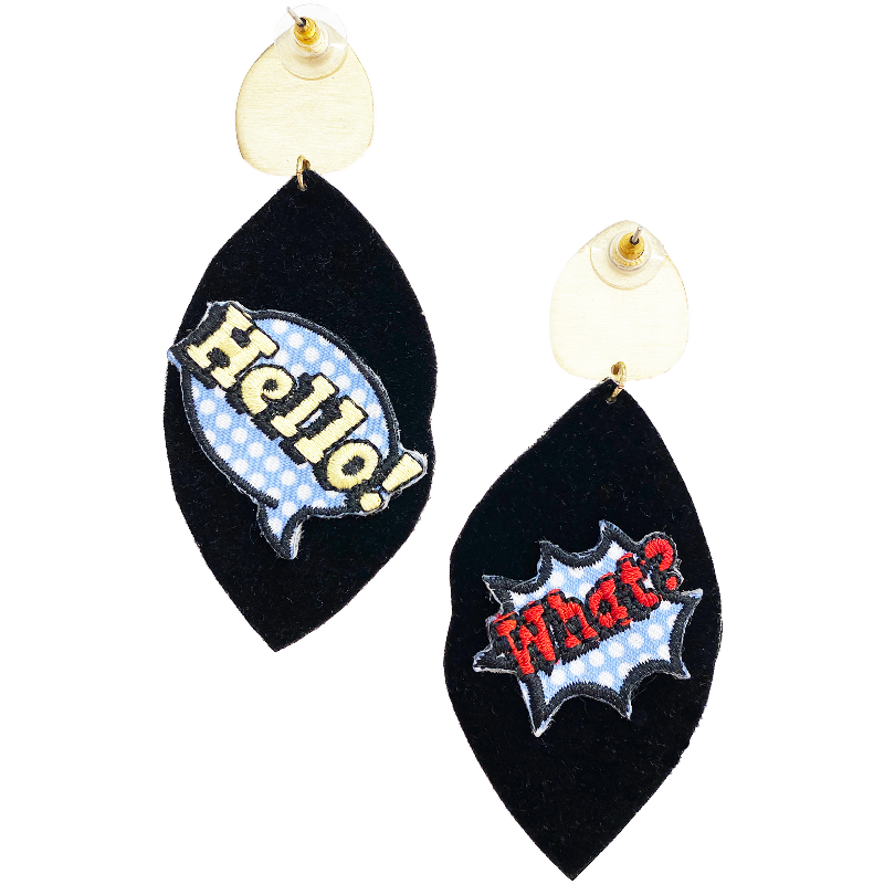 💋 Bold Patch Design: These earrings feature a bold "Hello / What?" patch that adds a playful vibe to your outfit, perfect for showcasing your personality.
