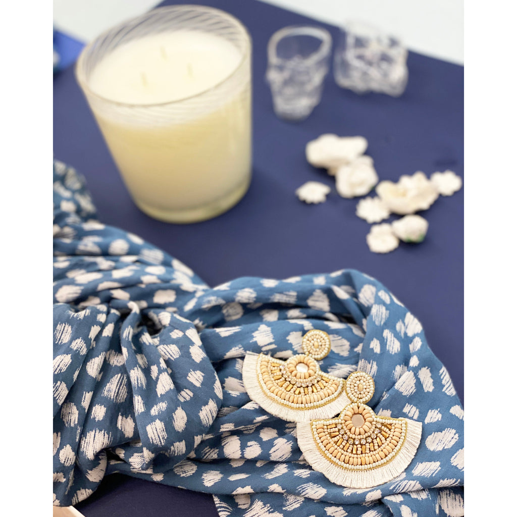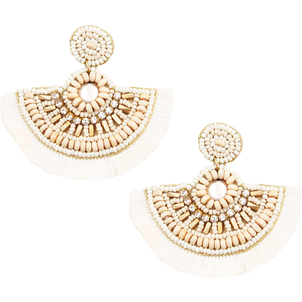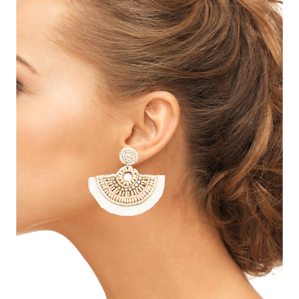 Pair the Honduras Ivory Fan Earrings with a flowy maxi dress for a boho vibe or dress them up with a sleek jumpsuit for a chic, modern look. Whether you're heading to a brunch date or a wedding, these earrings add flair to any outfit.