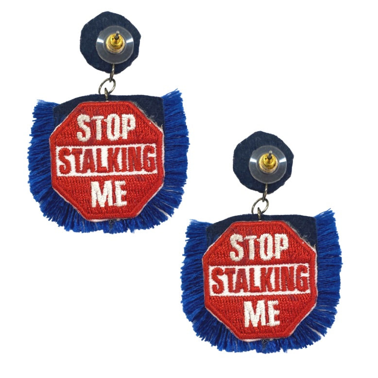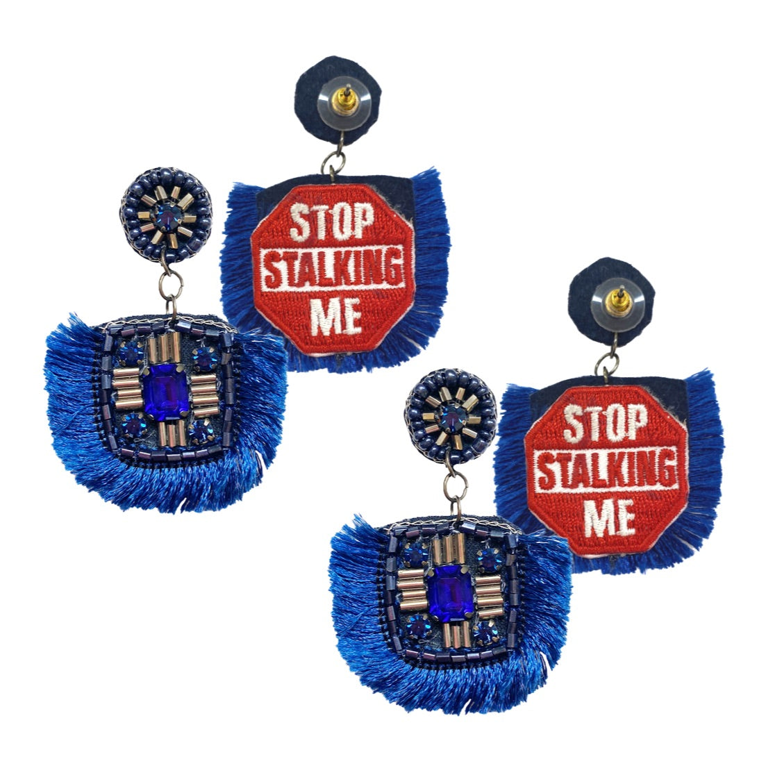 Unique Design: The La Dolce Vita Navy Earrings feature twinkling blue rhinestones and playful tassels with a fun "Stop Stalking Me" patch.