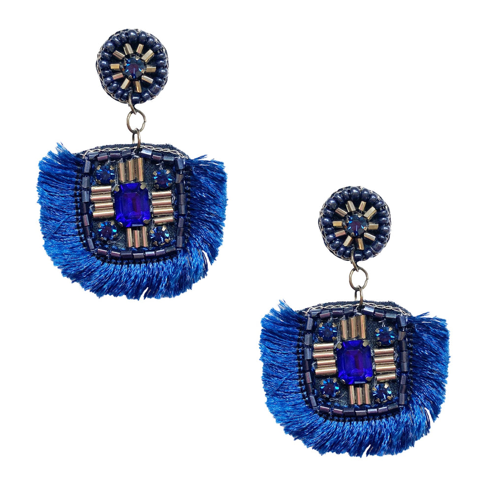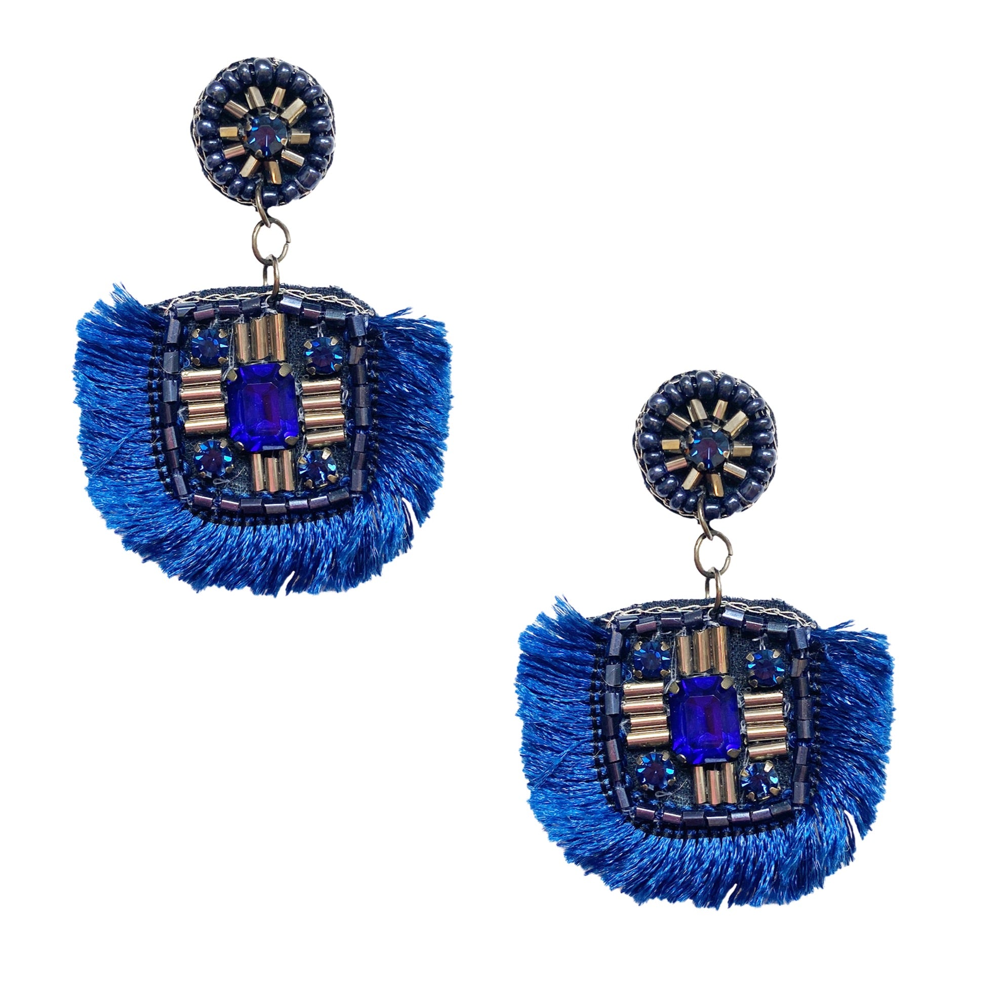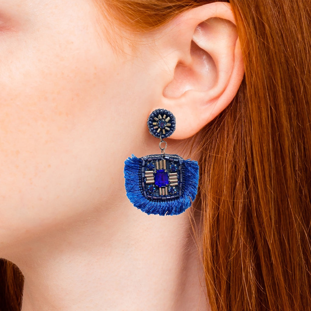 Our twinkling blue rhinestones and tassel-adorned forms lend a magic touch to our La Dolce Vita Navy Earrings. Striking in their simplicity, this pair evokes iconic lines and geometry of post-modern accessory design. These hypoallergenic, handcrafted earrings measure 2.25 inches by 1.8 inches and weigh 3 grams.