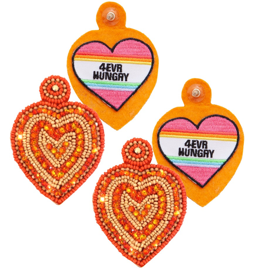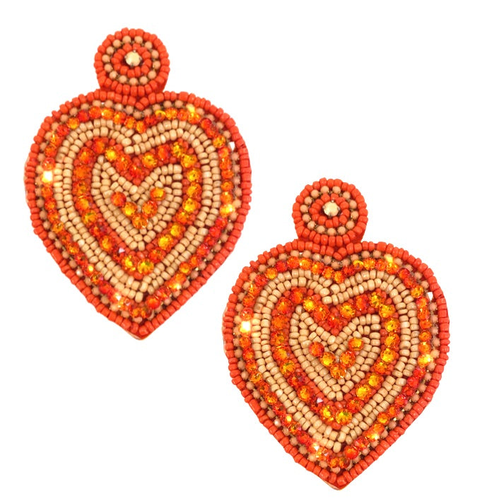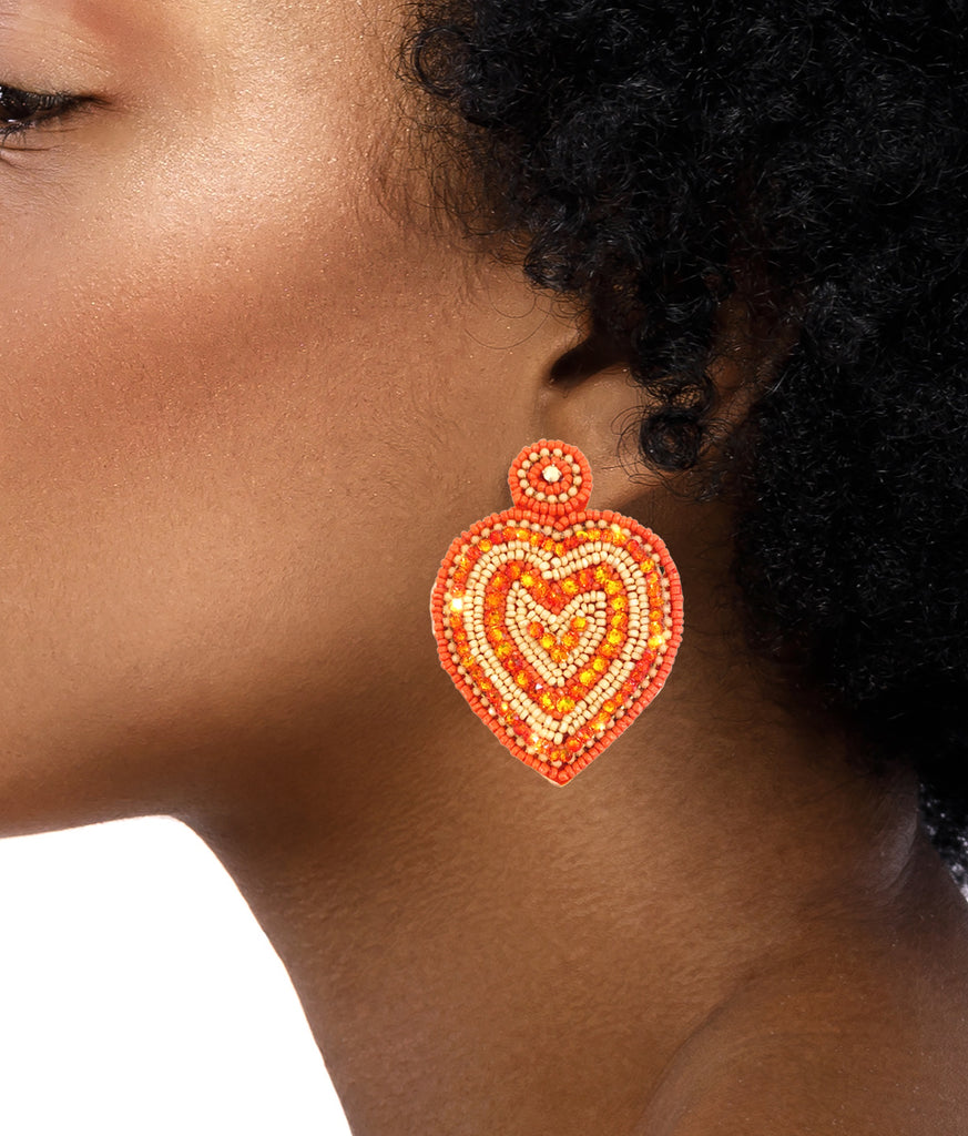 Keep your love on lockdown with our Love Rocks Tangerine Earrings. These handcrafted earrings feature bold beaded heart rings in vibrant tones of coral and orange, perfect for complementing a glam 70s-inspired look.