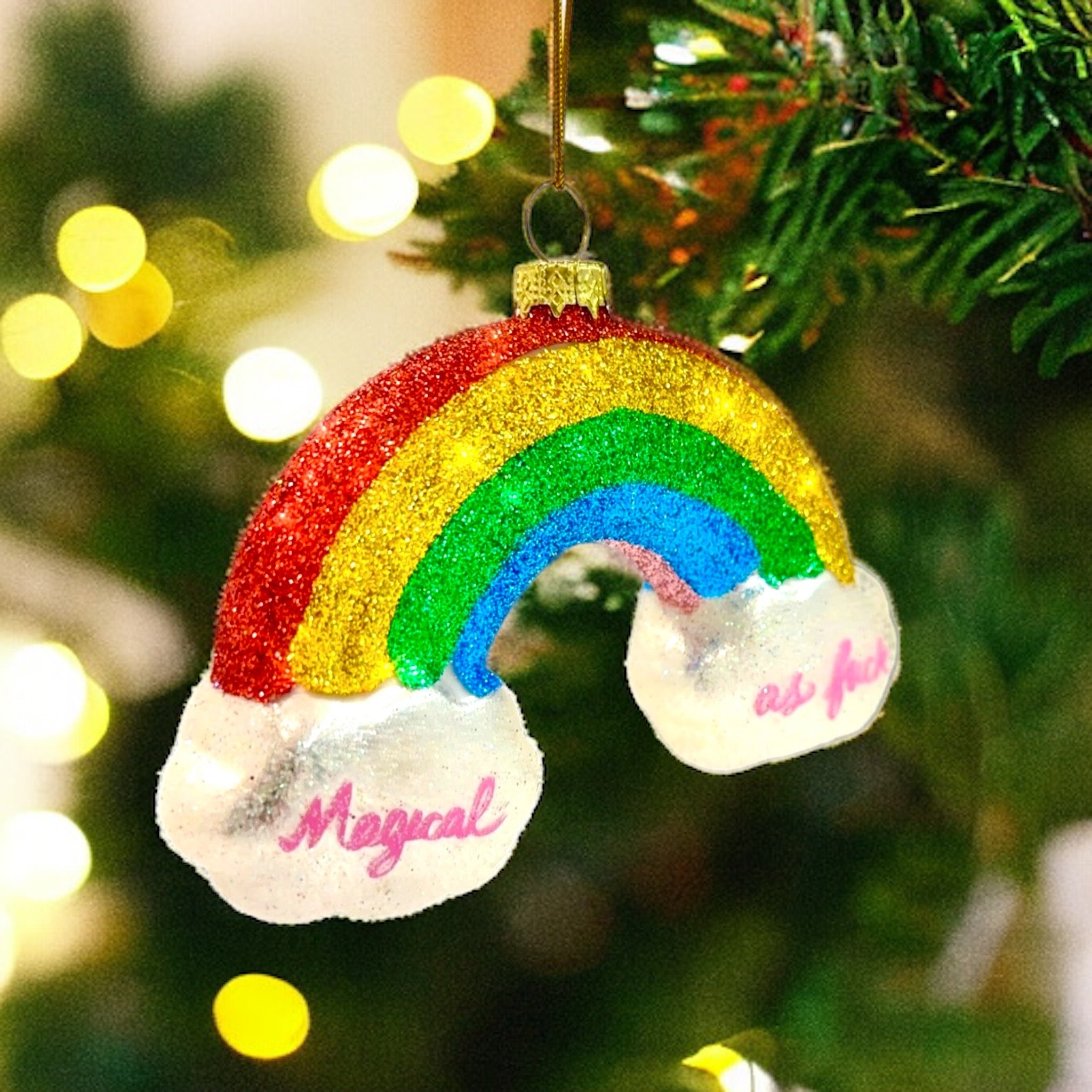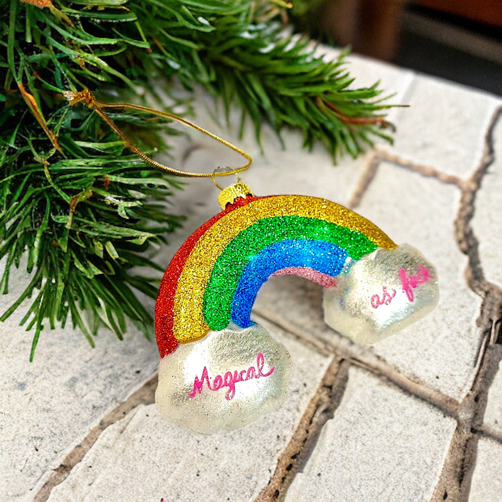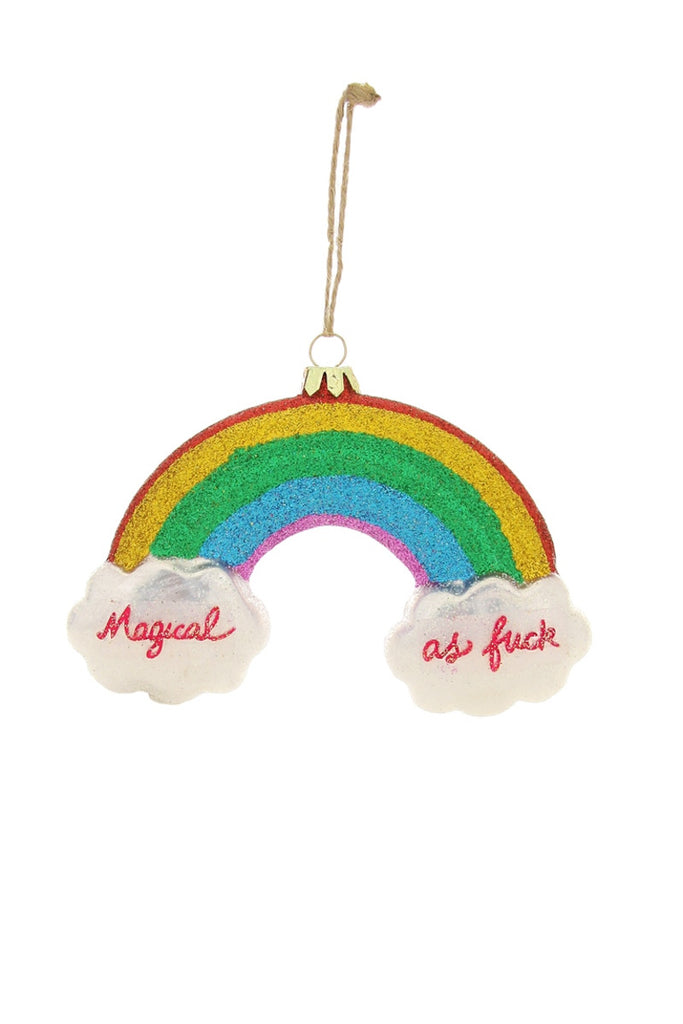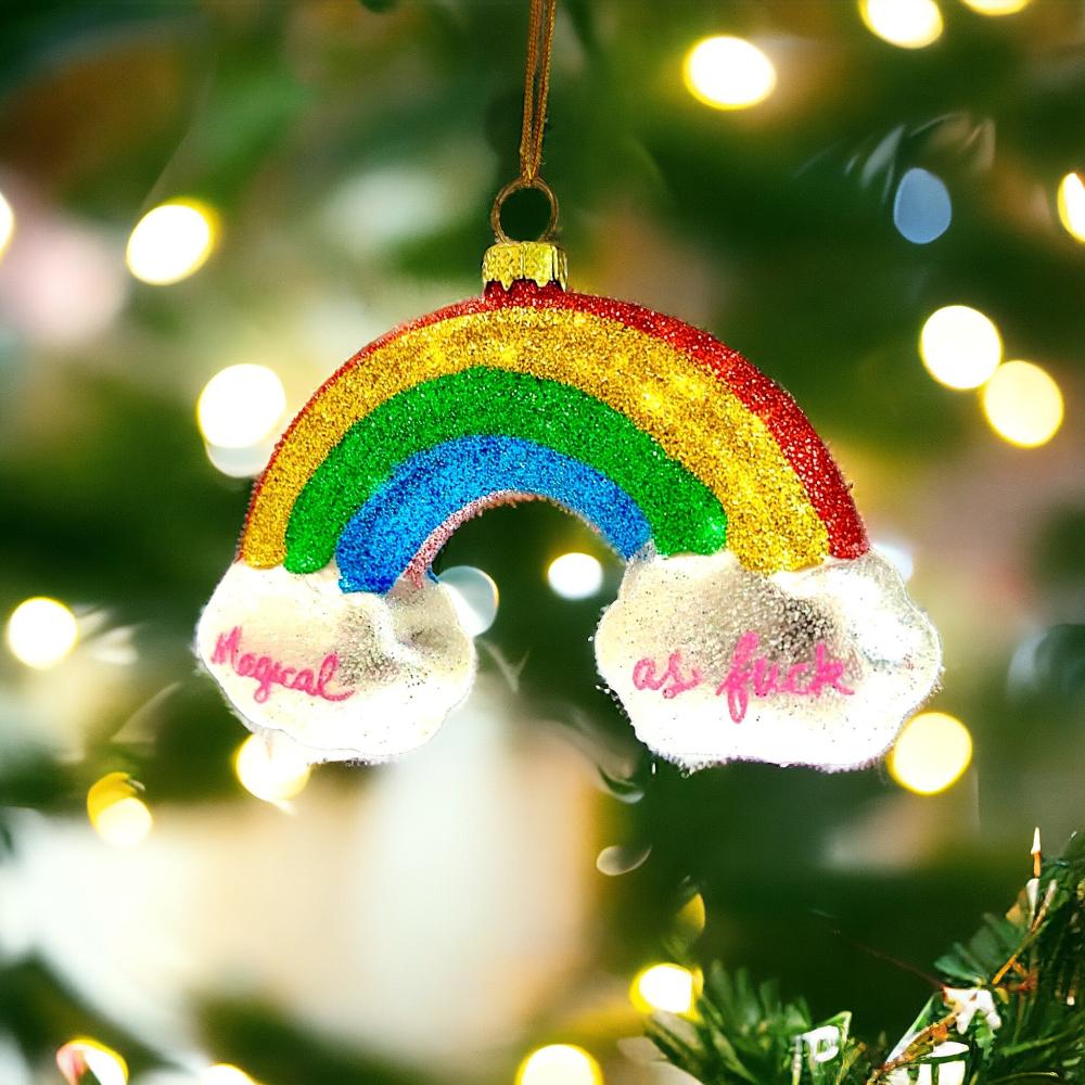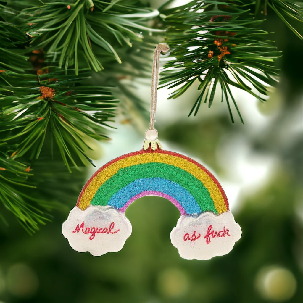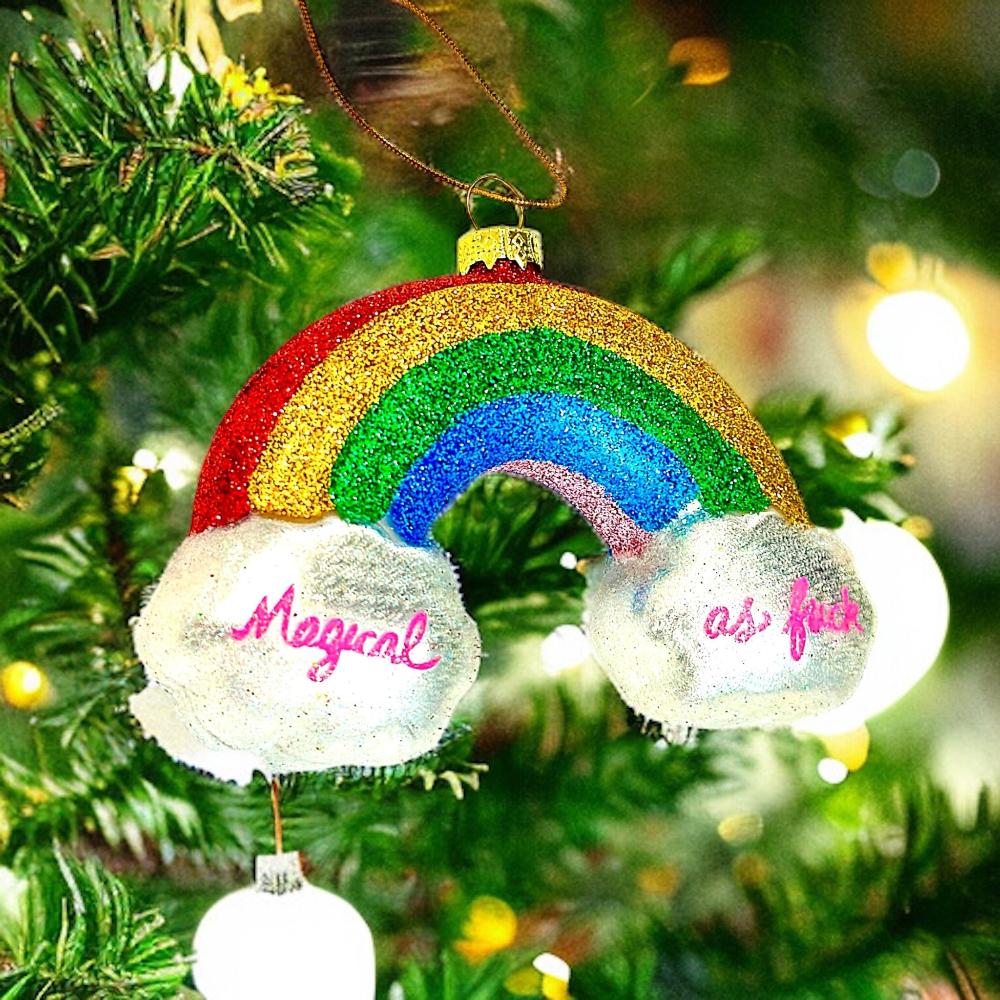 Experience a little magic this festive season with the "Magical AF Rainbow Ornament"! Hang this unique piece of decor and bring some sparkle and cheer into your home. Experience a magical transformation and watch the room shimmer with delight! (Warning: Does not contain actual magic.)