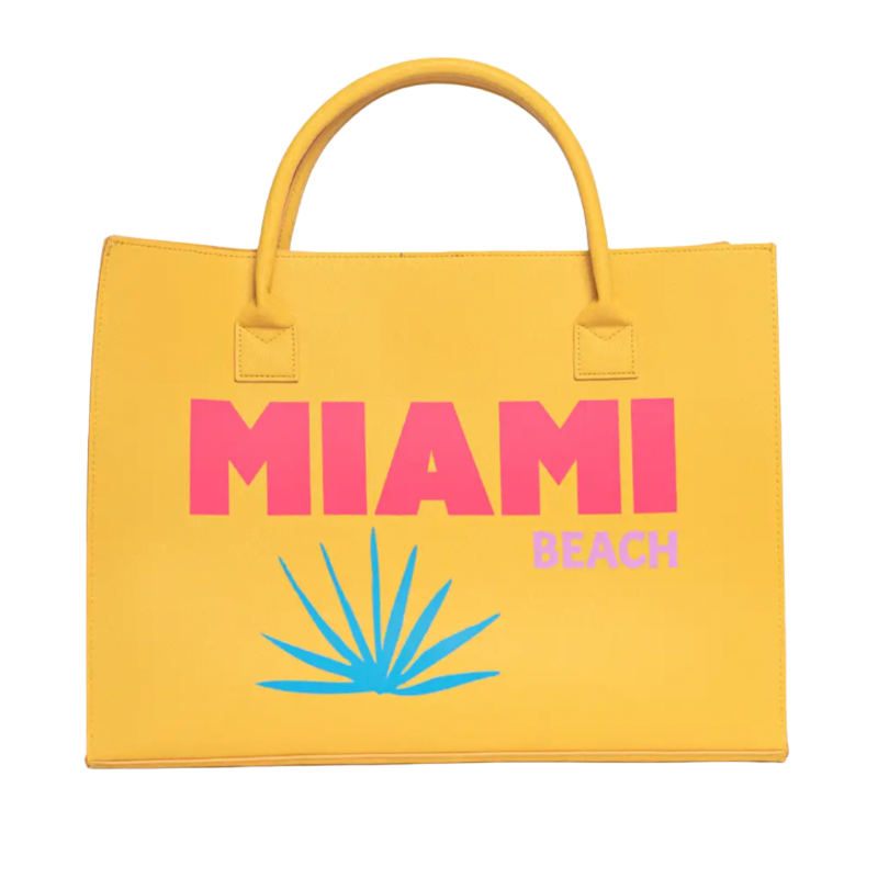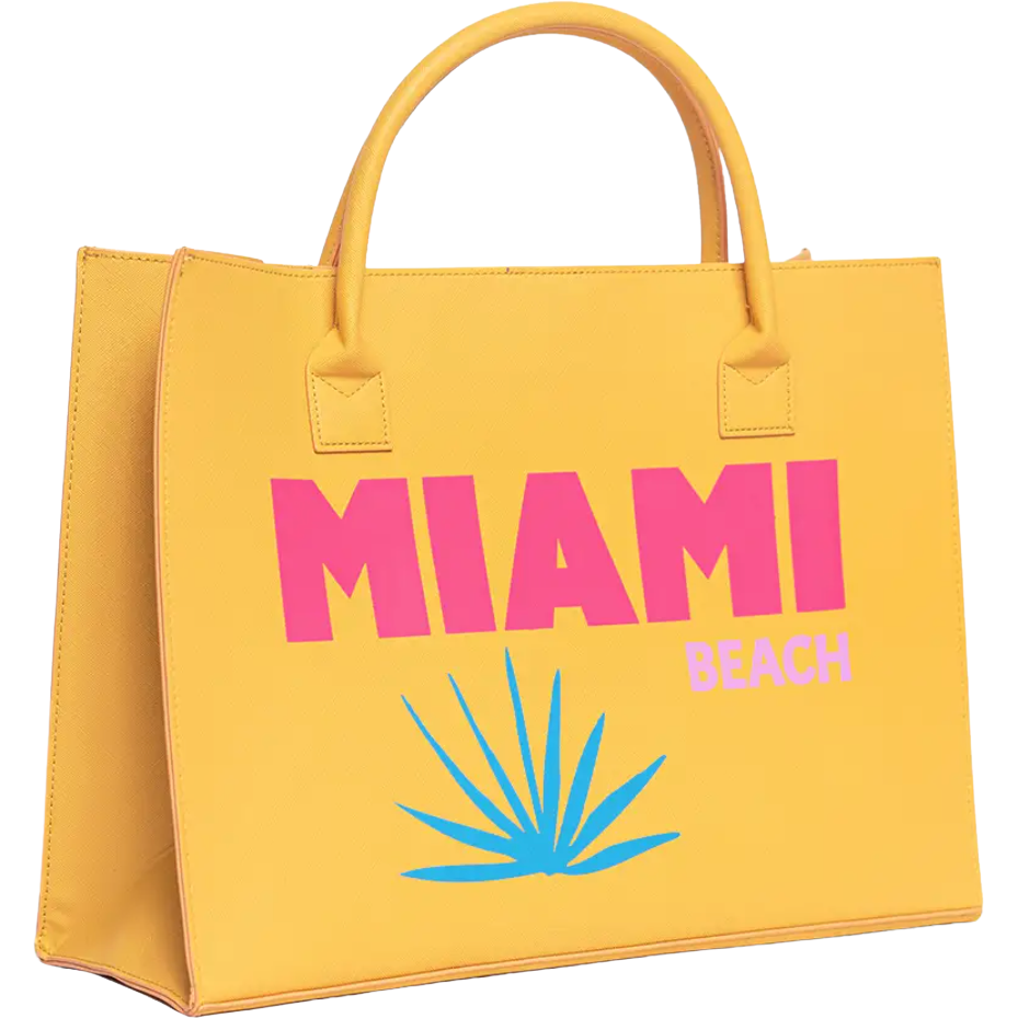 Add a pop of sunshine to your wardrobe with this vibrant Yellow Miami Beach Tote Bag. Perfect for sunny beach days, this large tote offers ample space to carry all your essentials in style. Its bold "Miami Beach" print and bright colors make it a statement piece that stands out wherever you go. Lightweight and durable, this tote is your perfect companion for vacation or everyday adventures.