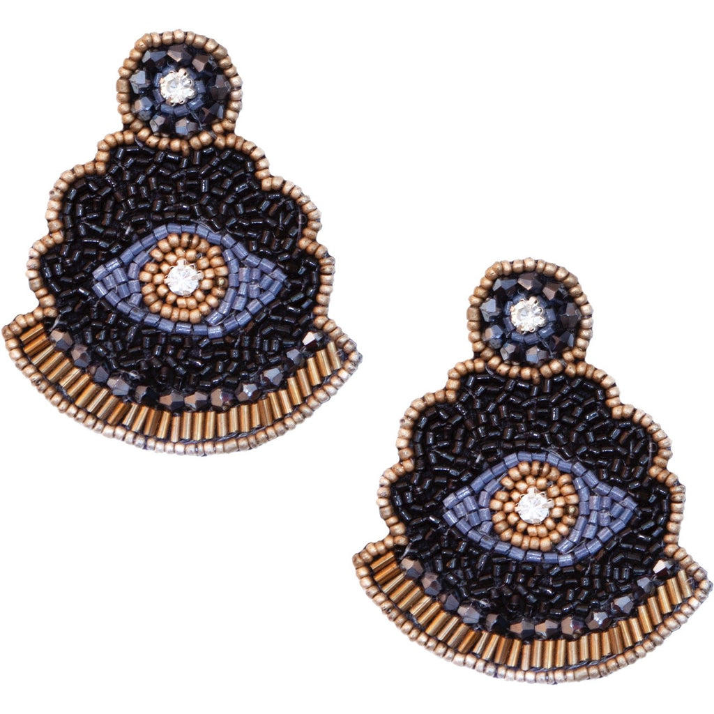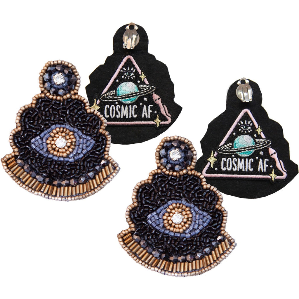 Our Mystical Misfit black and gold earrings combine high-fashion with a mystical vibe. Designed with the classic evil eye design in the middle and beaded fringes underneath, this set is a great choice for those who want a calm yet cute look.