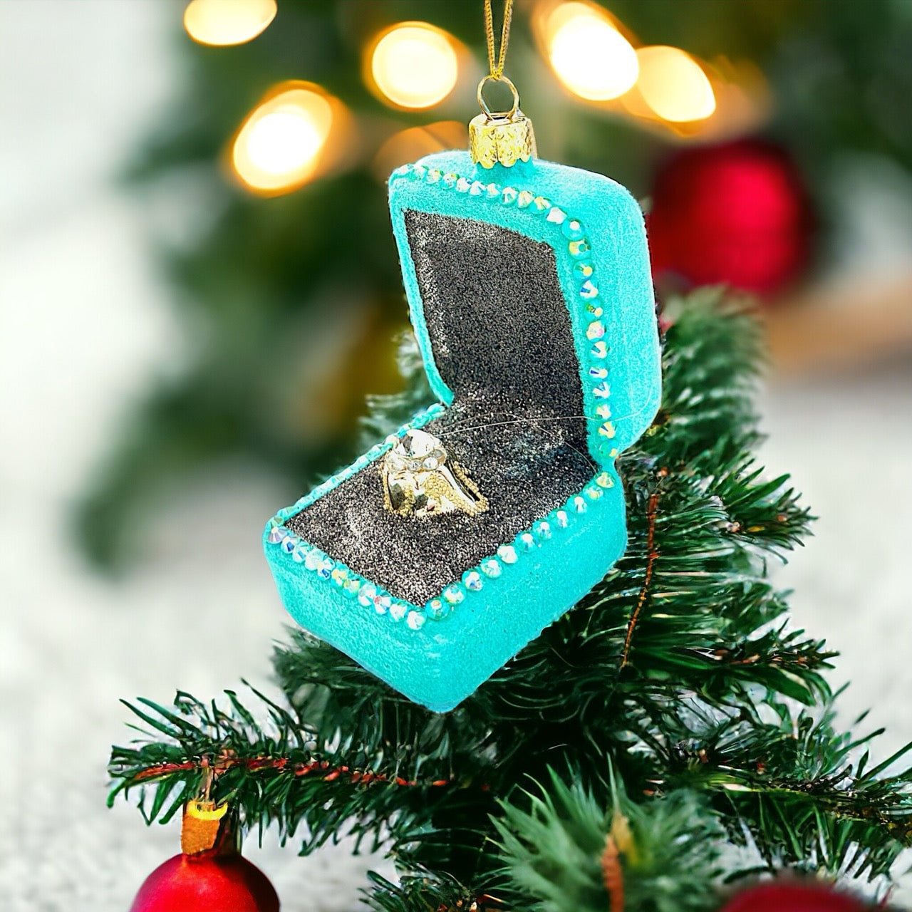 💎 Elegant Design: This ornament features a beautiful diamond ring design inside a detailed presentation box, adding a touch of glamour to your holiday decor.