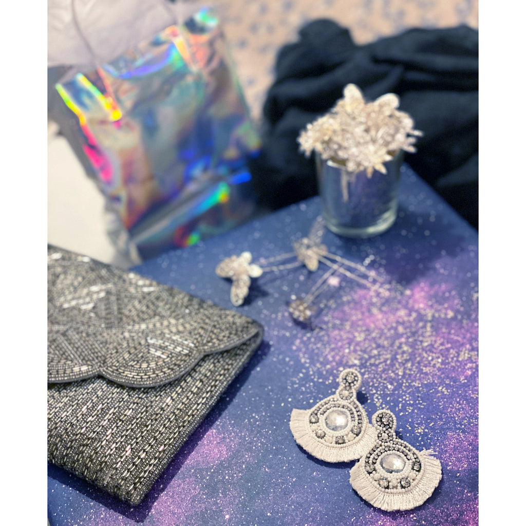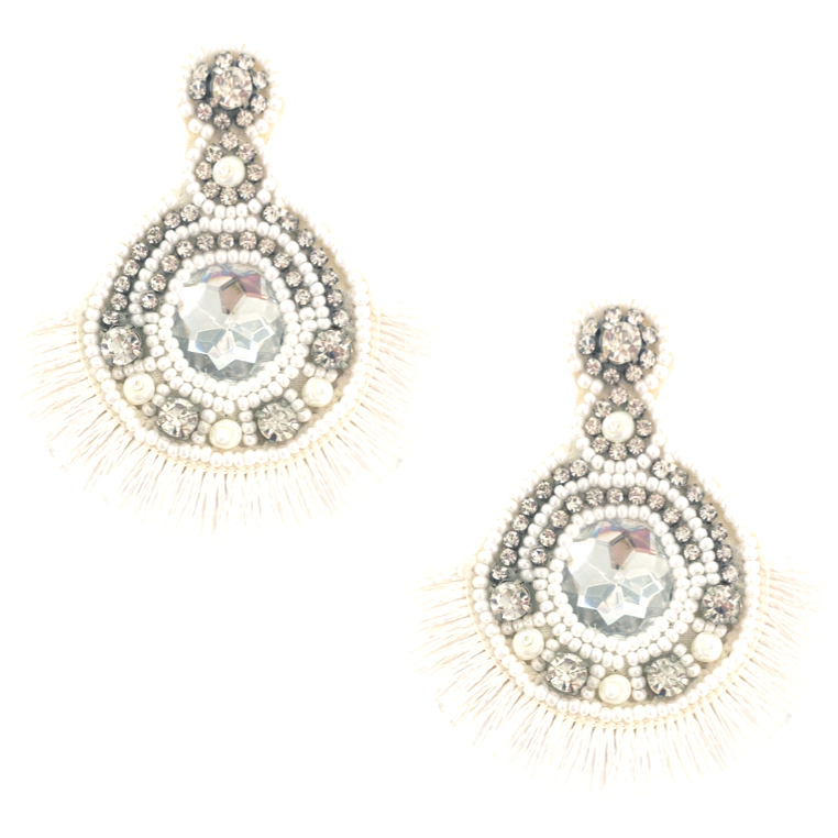 Shine bright in our Space Oddity White Earrings, adorned with sparkling white rhinestones, delicate pearls, and silver trimmings. These earrings are the perfect accessory for bridal wear or to complement any elegant white outfit. With a unique space-themed design, they add a majestic and glamorous touch to your style.