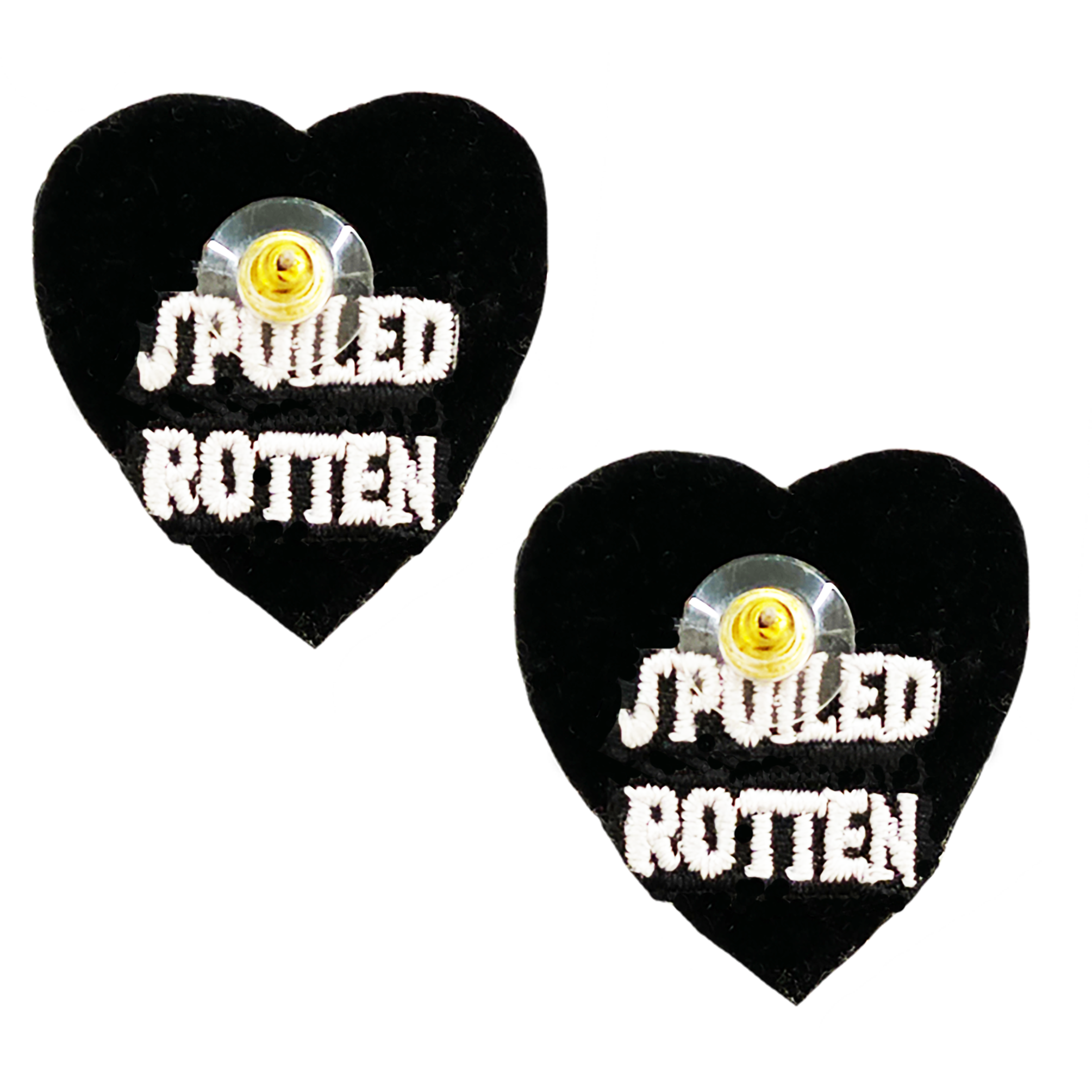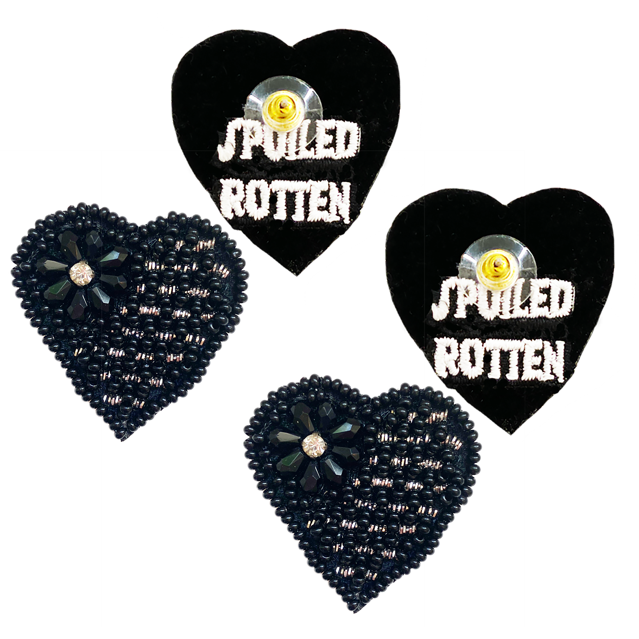 Show off your playful side with these Spoiled Rotten Midnight Heart Studs! Designed for comfort and style, these black heart earrings feature a cheeky patch design that makes them an instant conversation starter. Lightweight, hypoallergenic, and handcrafted, they’re perfect for weddings, cocktail parties, or casual outings.
