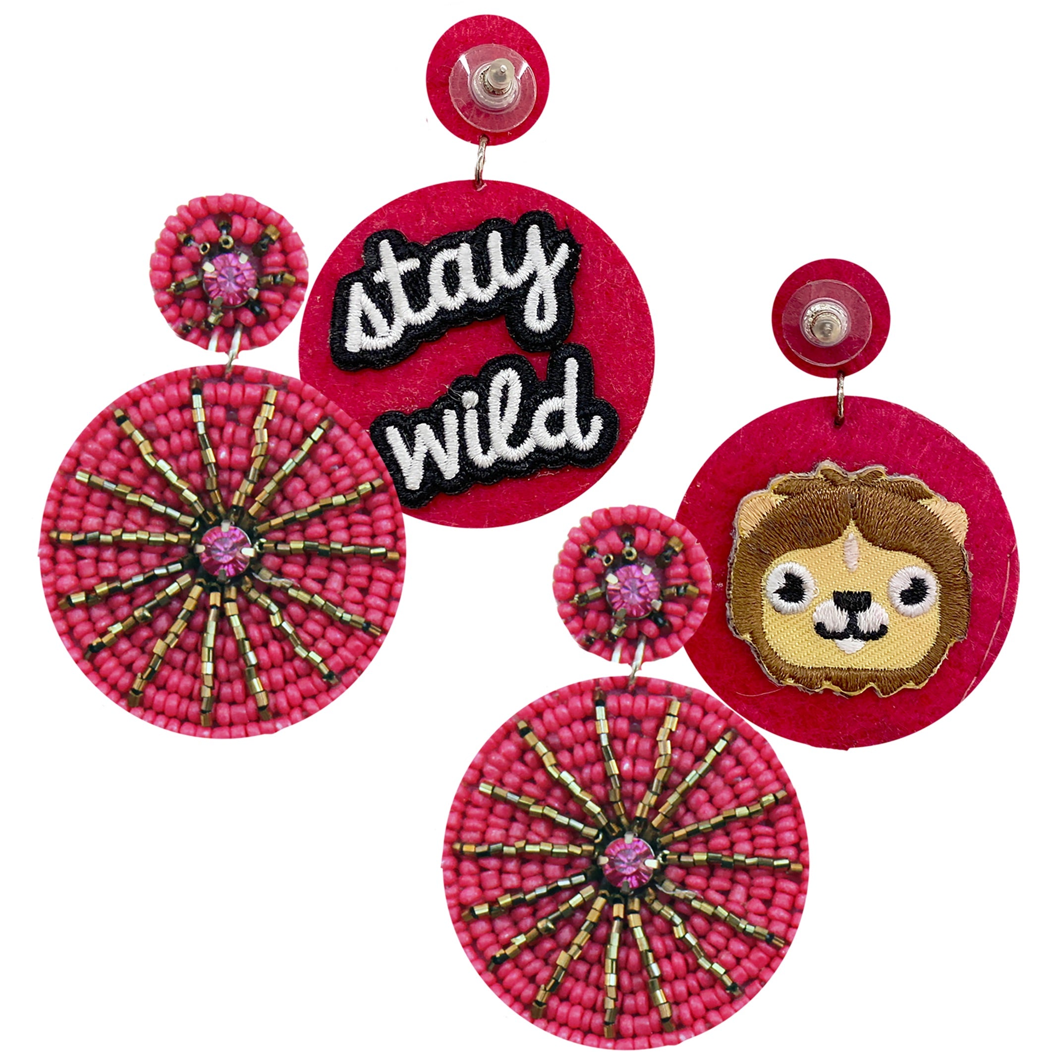 Experience a burst of vibrant color with our "Starburst Fuchsia Earrings." These fiery statement earrings feature a bold fuchsia design complemented by fun patches including "Stay Wild" and a playful lion. Perfect for adding a pop of color and a bit of fun to any outfit, these earrings are sure to make you stand out.