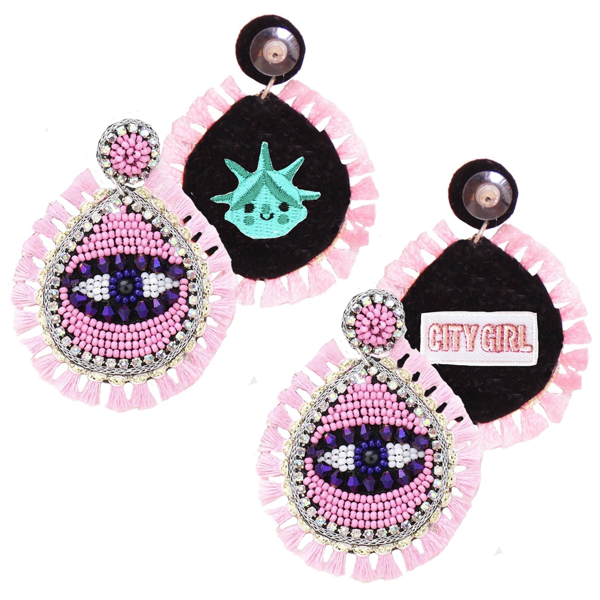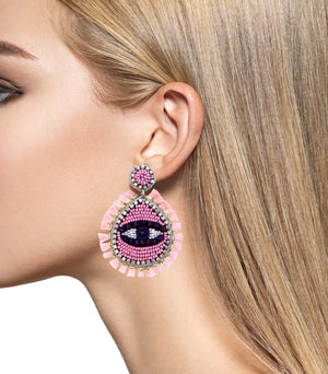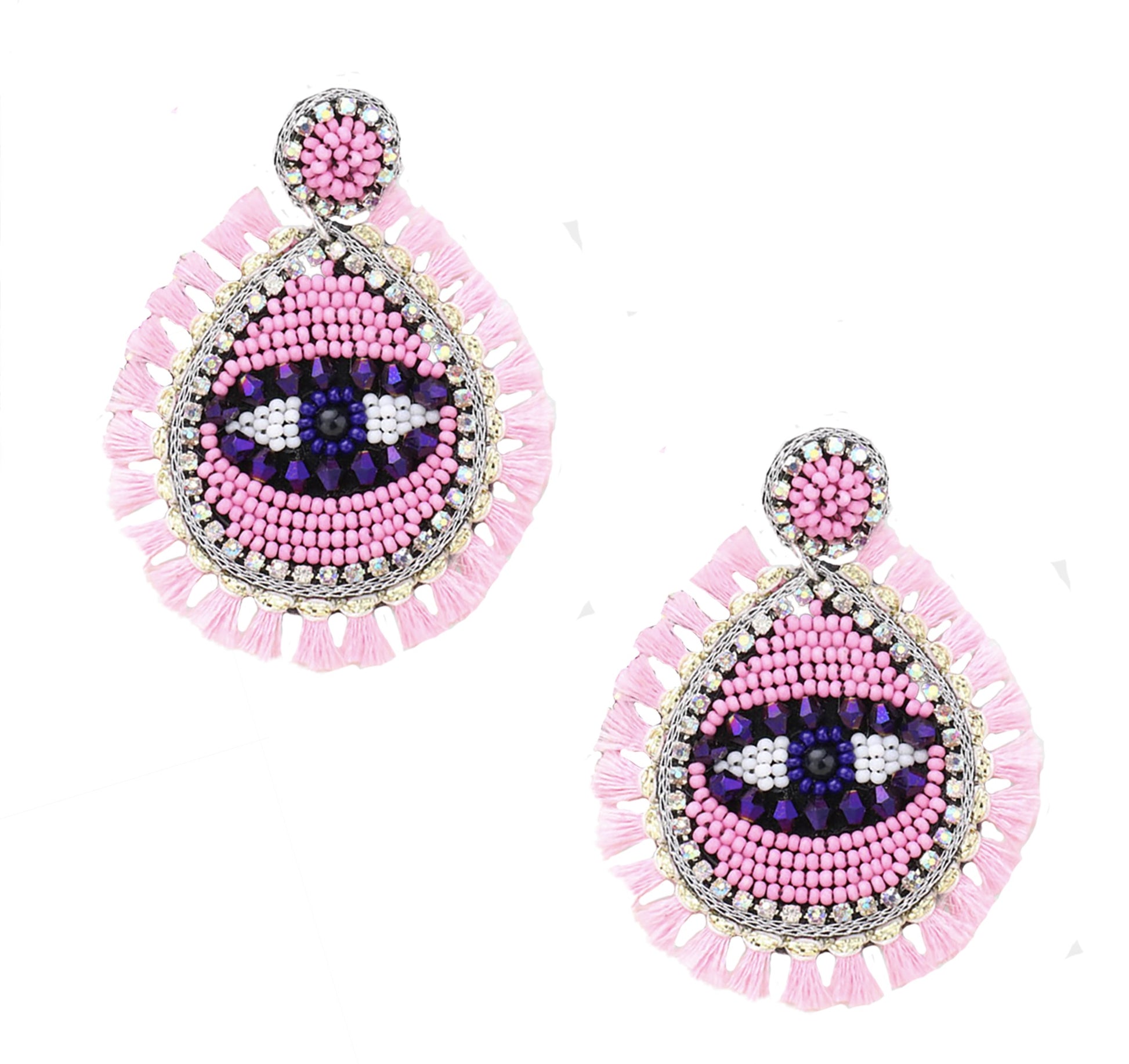 Did you know that the evil eye is a superstitious curse originating in Ancient Greece, believed to be caused by a malevolent look? The evil eye in jewelry was thought to cast off such evil glares. We've designed our very own evil eye protection earrings, in a teardrop shape, with little fringes all around the edges and mini rhinestones to seal our intricate beadwork.