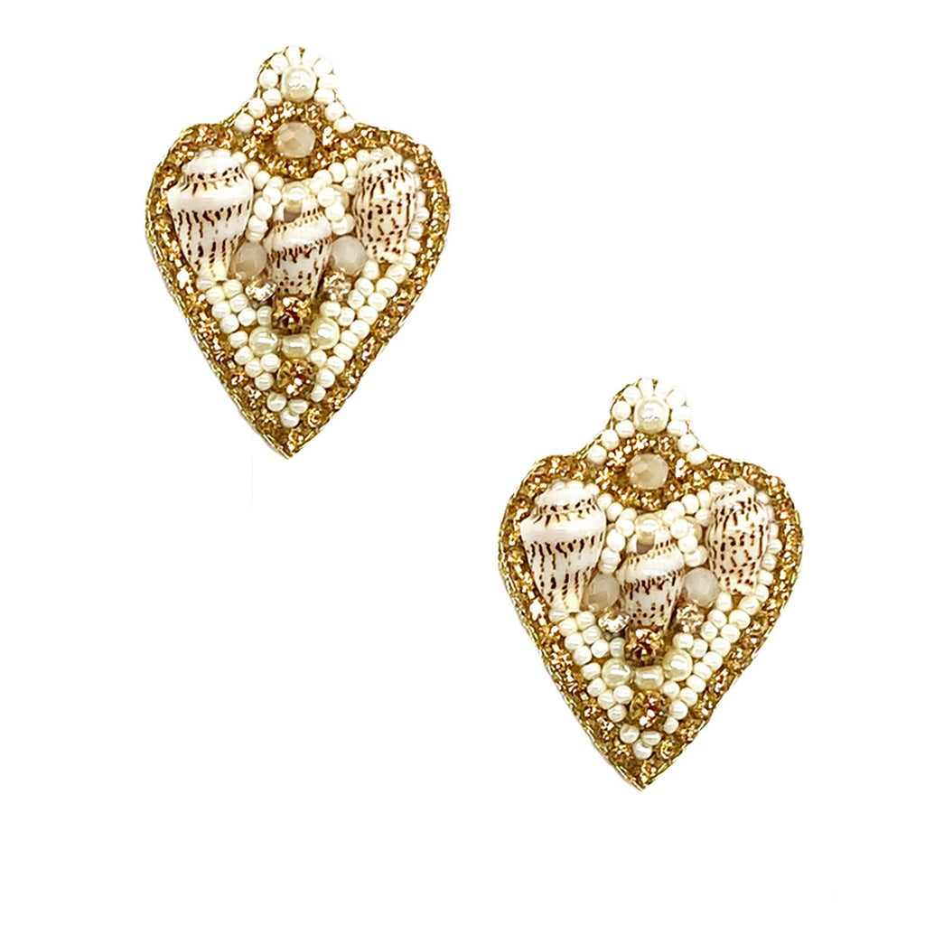 These Shore Thing Earrings feature adorable heart-shaped shells surrounded by intricate white beading and gold rhinestones, making them the perfect stylish accessory. Their unique WTF patch design adds a playful twist to any outfit, effortlessly combining elegance and fun. Lightweight and eye-catching, these earrings are a must-have for those who love to make a bold statement with their jewelry.