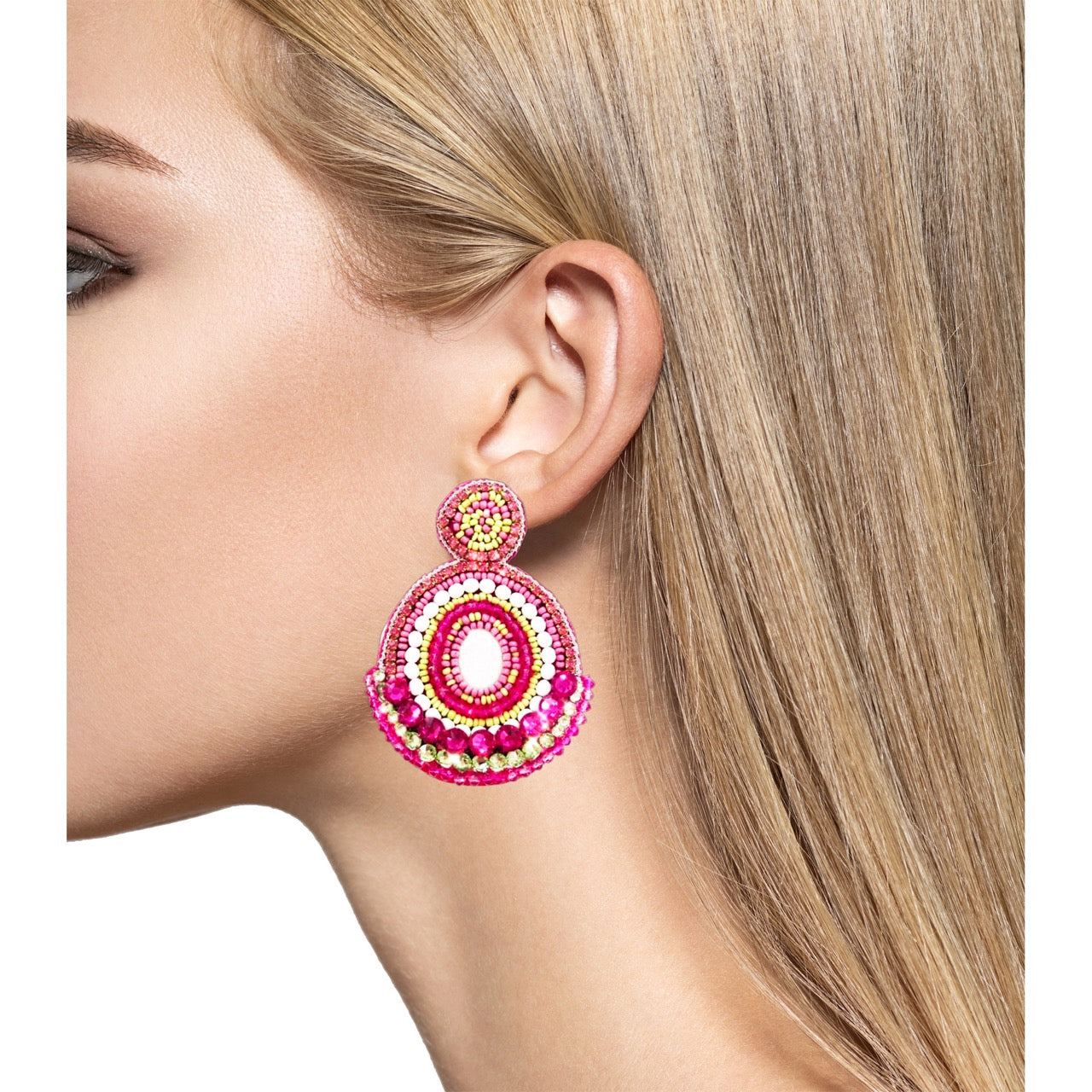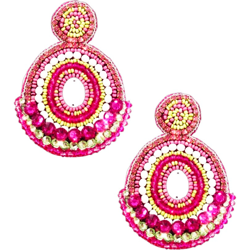 🌸 Handcrafted Beading: These earrings feature intricate hand-beaded designs in vibrant pink and green, adding a unique and colorful touch.