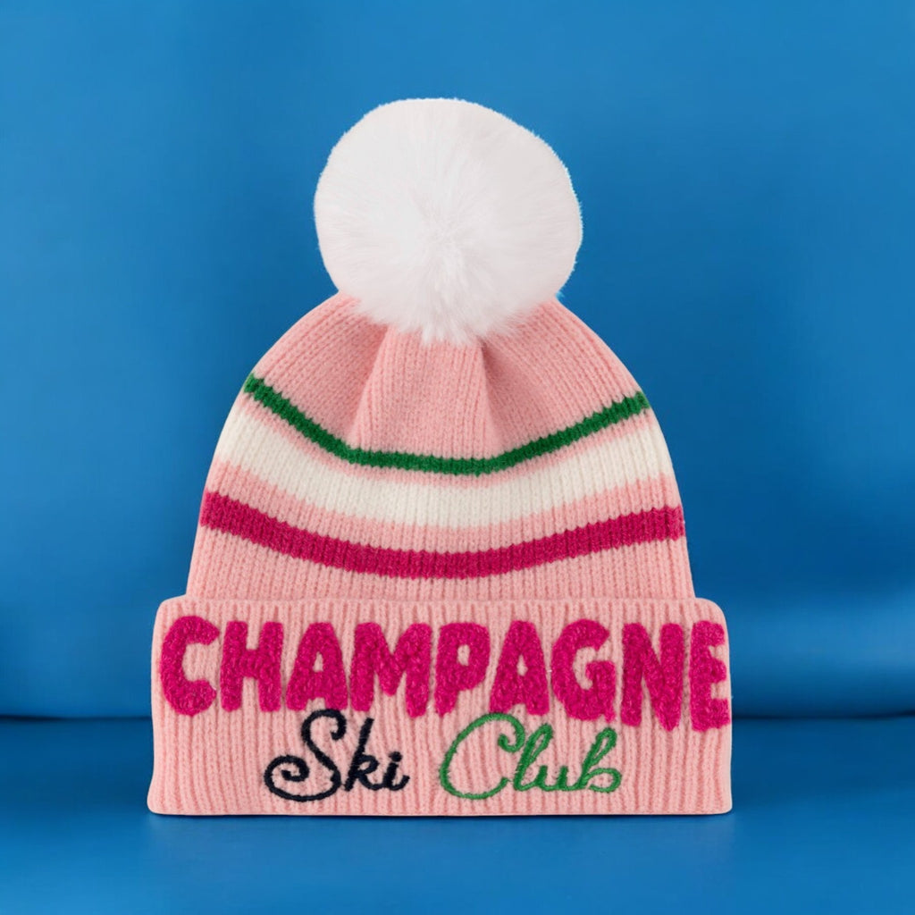 This stylish pink beanie features playful "Champagne Ski Club" embroidery and a fluffy pom pom on top, perfect for keeping you warm during winter outings. Made from high-quality knitted fabric, it adds a fashionable touch to any winter outfit, making it a must-have accessory for cold weather.