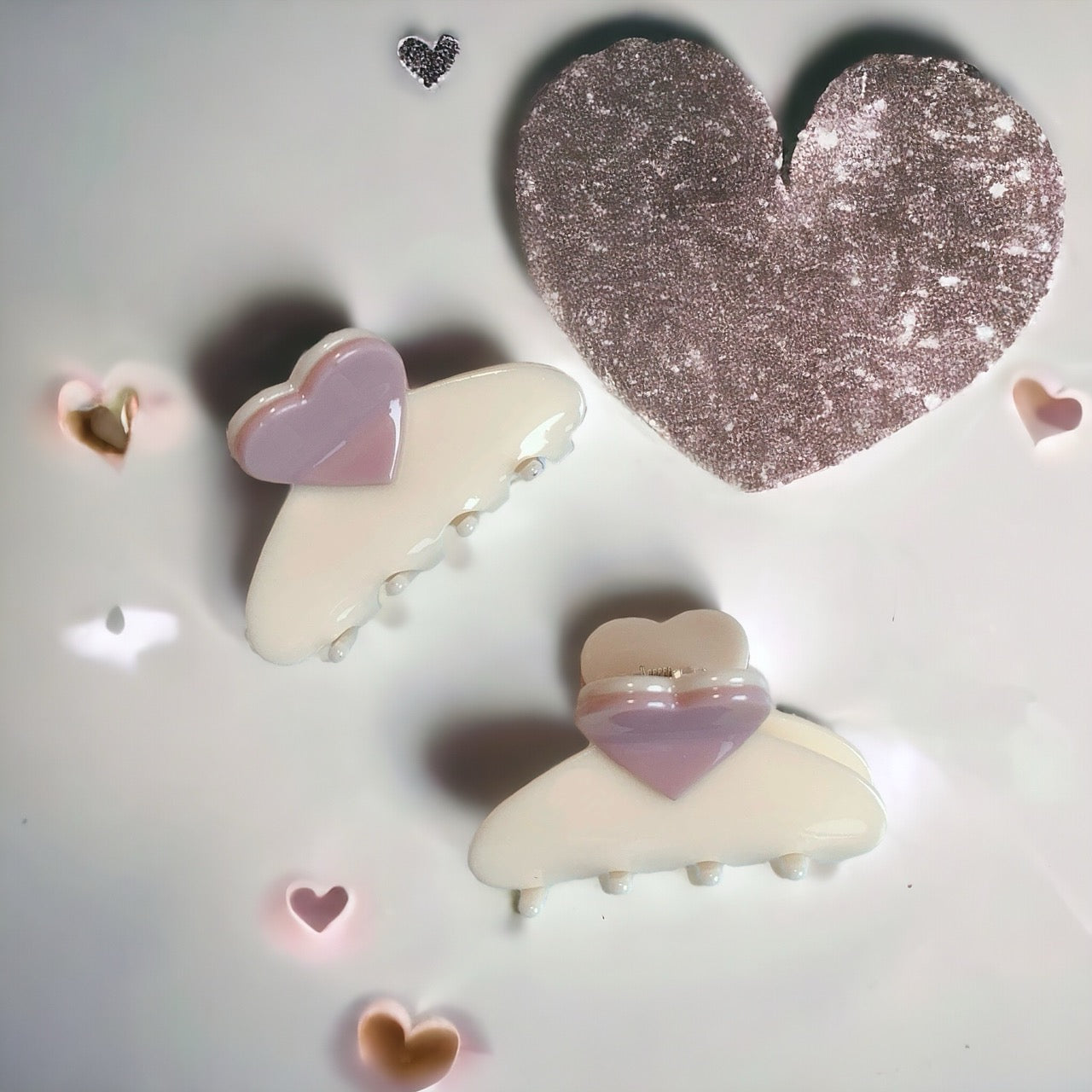 Elevate your hairstyle with these adorable heart-shaped pastel hair claw clips. Perfect for adding a cute and stylish touch to any look, these clips feature a glittery heart design in soft pink and white tones. They provide a secure hold while enhancing your outfit with a touch of glamour.