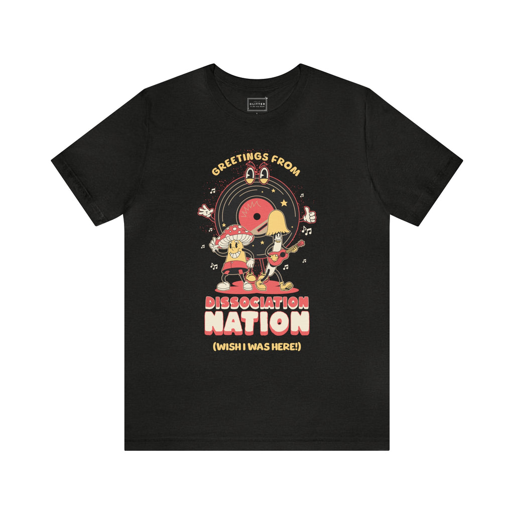 Unique and Playful Design: The "Greetings from Dissociation Nation" graphic makes this tee a fun and unique addition to any wardrobe.