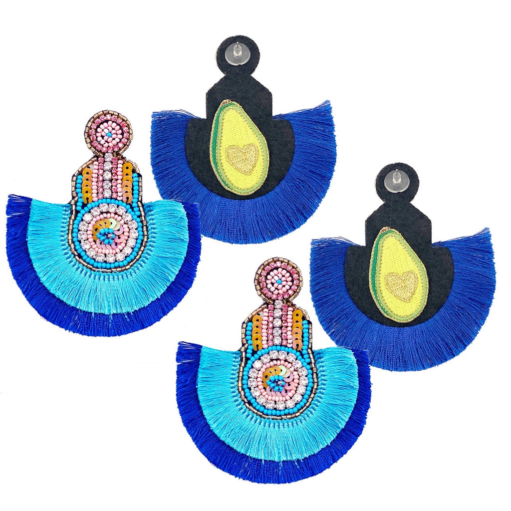 Unique Design: The La Dolce Vita Navy Earrings feature twinkling blue rhinestones and playful tassels with a fun "Stop Stalking Me" patch.
